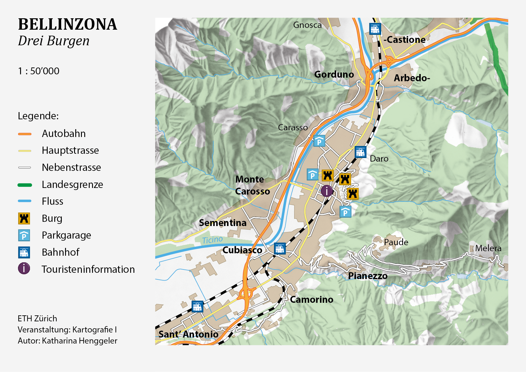 Map showing the Swiss UNESCO world heritage site of the tree castles in Bellinzona.