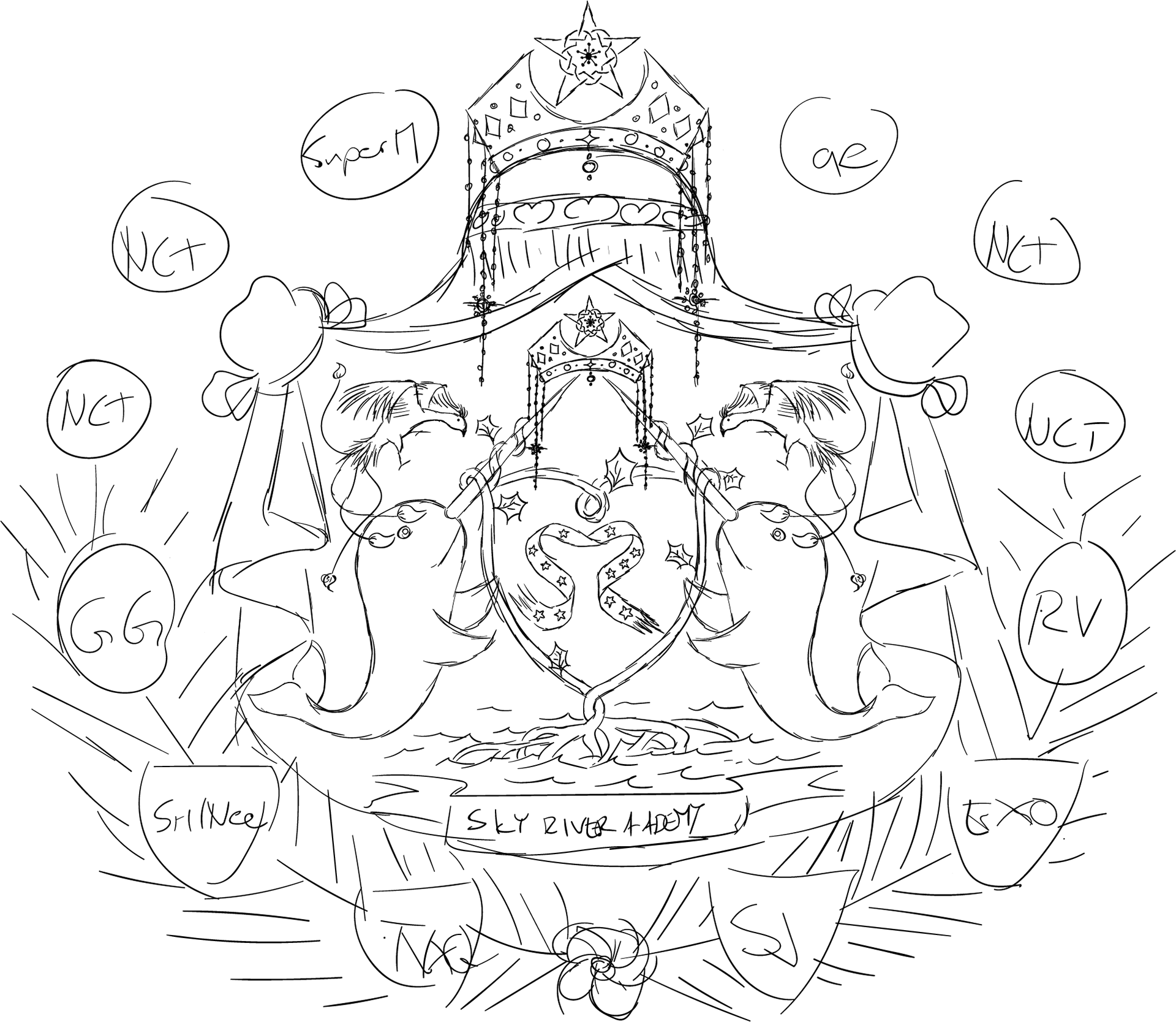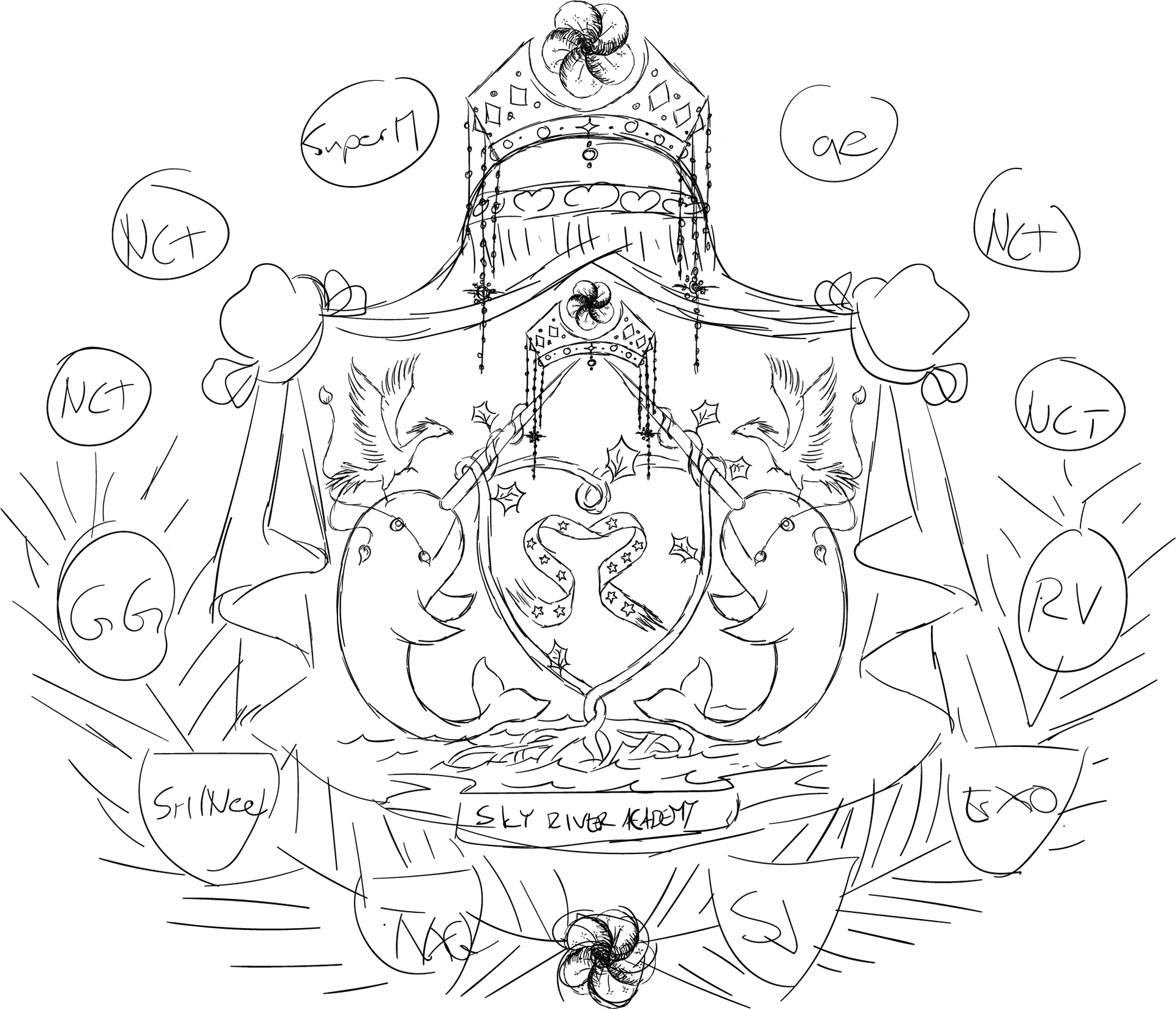 In the early drafting stages, the setting the story was much bigger; it featured the entire SM Entertainment universe with the fandoms of all the label's different acts. Rosypeaches therefore initially commissioned a complete (in the heraldic sense) coat of arms featuring the fandom logos of TVXQ, Super Junior, SHINee, EXO, Girls Generation, Red Velvet, NCT, SuperM, and aespa.