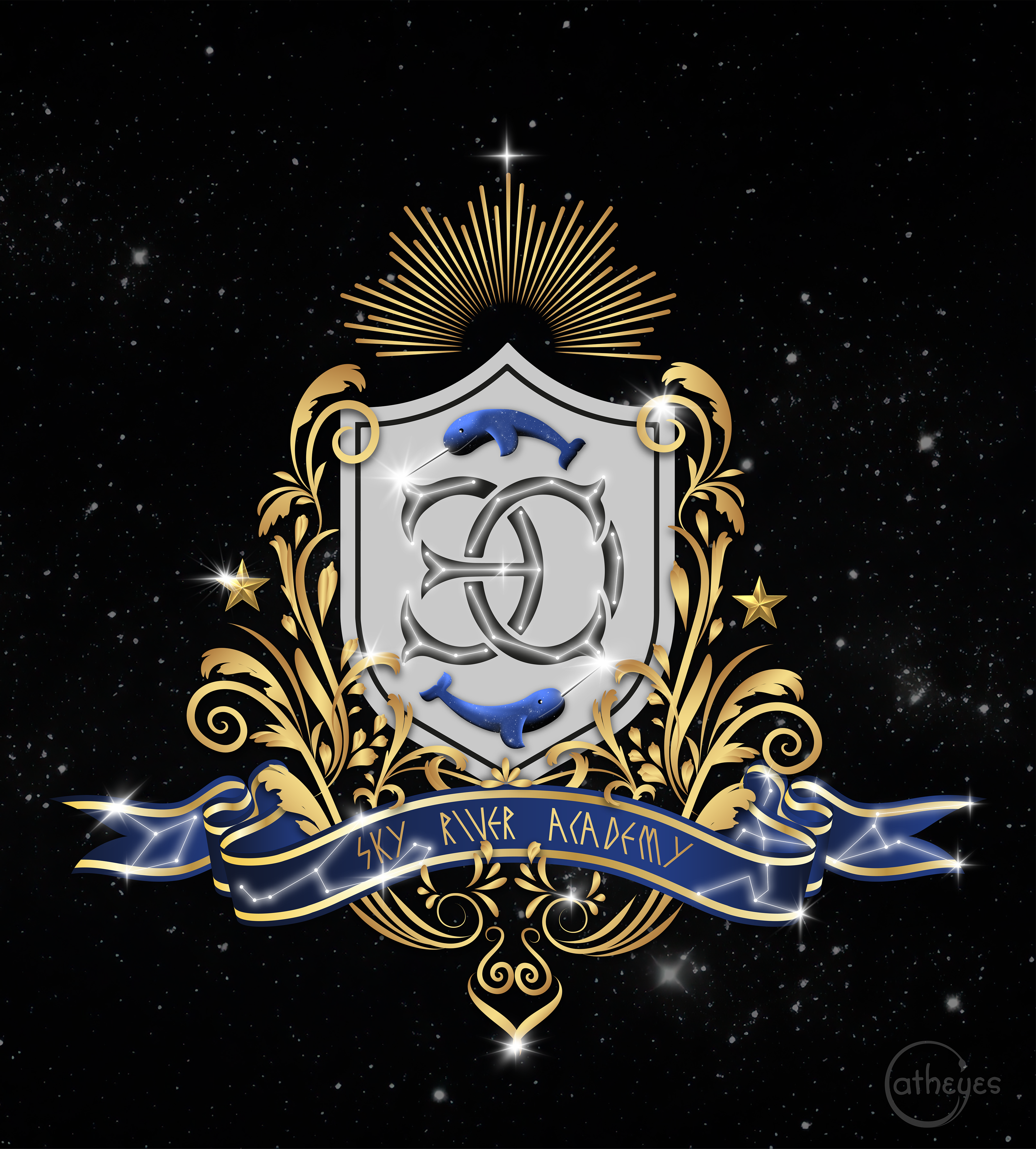 A coat of arms for the magical Sky River Academy, the setting of a future fanfiction story Fire Lily by rosypeaches on Asianfanfics.com.