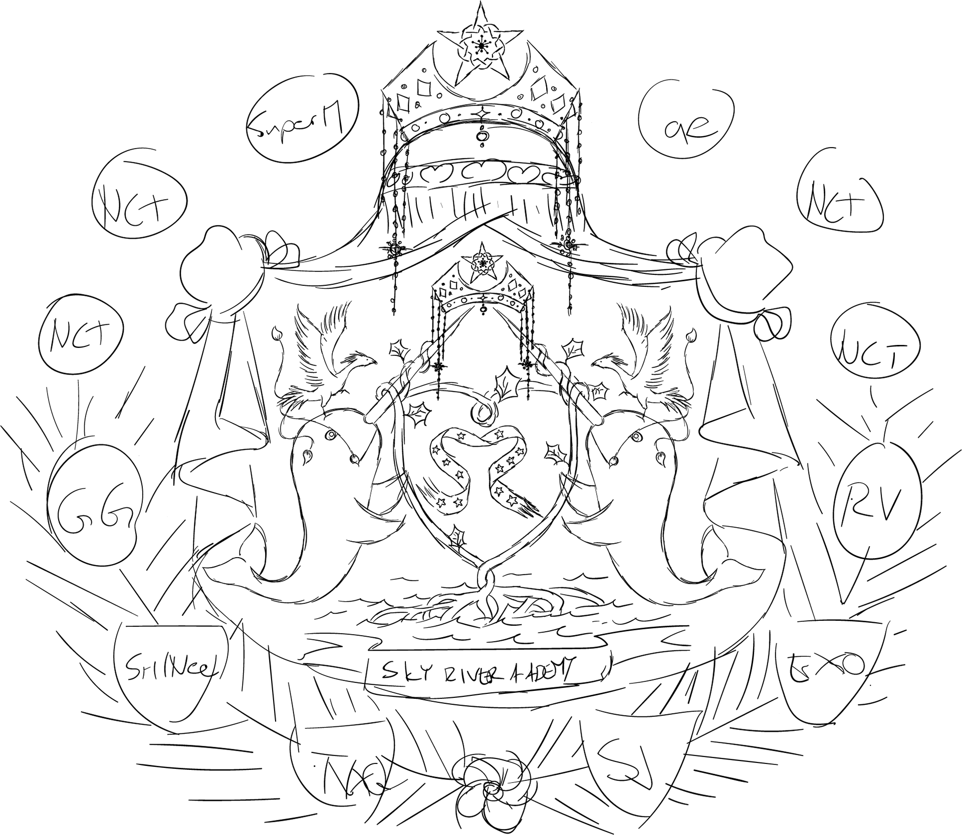 The shield/escutcheon shows a band or river of stars--the sky river--inspired by the SM Entertainment logo. There are exactly 12 stars on the band, representing the 12 schools (fandoms).